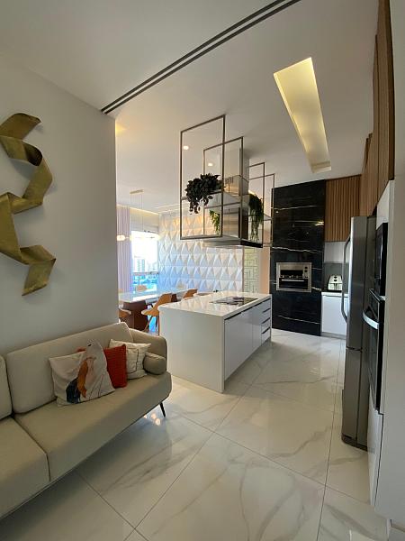 • Cozinha moderna com ilha, totalmente equipada e integrada aos ambientes