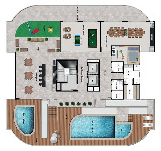 Piscina adulto com prainha, Piscina infantil, Sauna, Churrasqueira, Salão de festas, Espaço gourmet, Brinquedoteca e Sala deJogos.