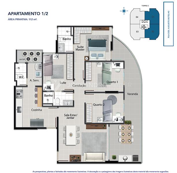 O apartamento possui 04 quartos sendo uma suíte master e uma suíte canadense. 03 vagas de garagem e 112m² de área privativa.